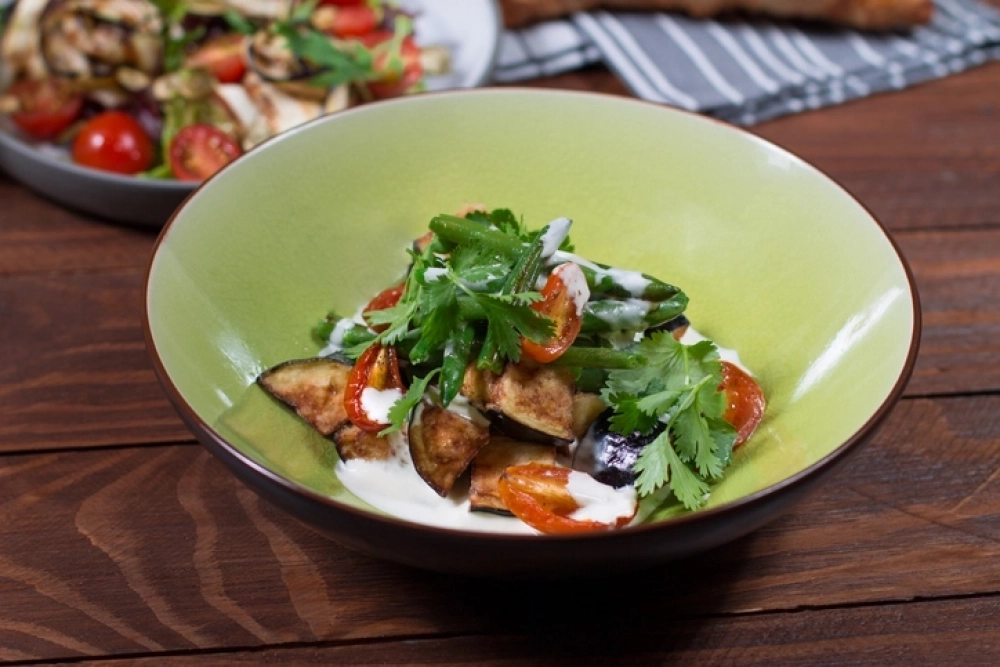Салат с хрустящими баклажанами и томатами с муссом из феты