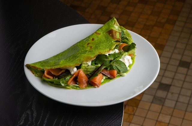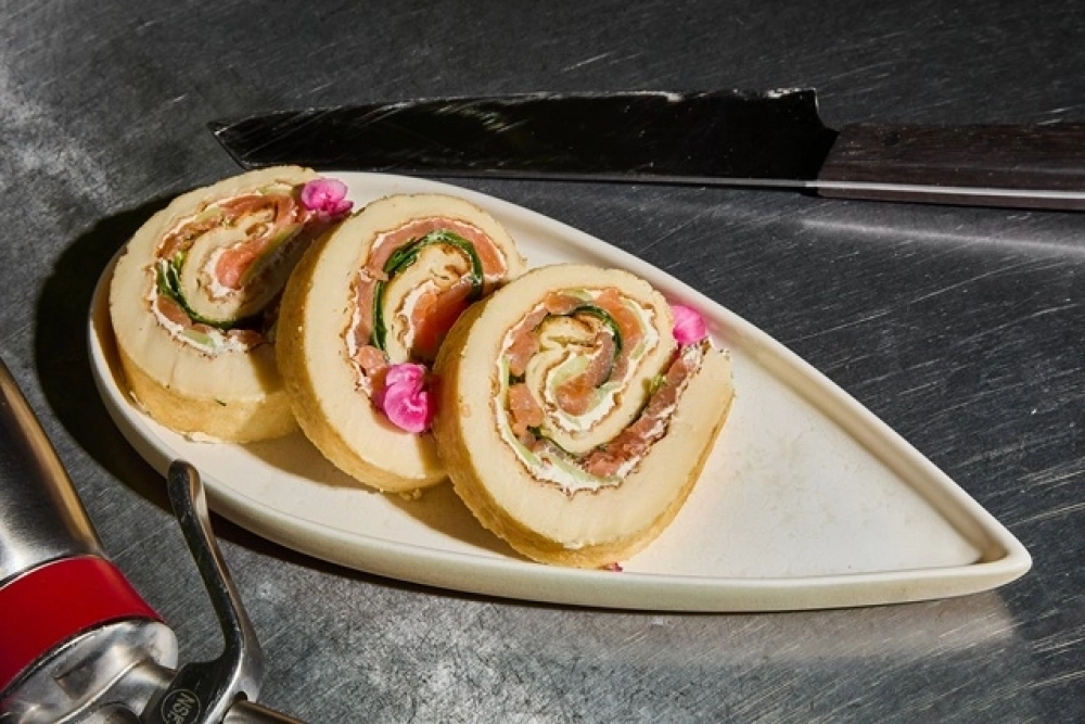 Шаг 10. Вариант № 1. Разрежьте паннукакку на 4 прямоугольника, смажьте кремом, выложите семгу и огурцы, сверните пополам в виде сэндвича.