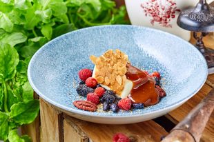 9Подача: на тарелку выложить ассорти ягод, на них положить мусс (размороженный, но охлажденный), сверху полить остывшей карамелью. Можно добавить обжаренный пекан.