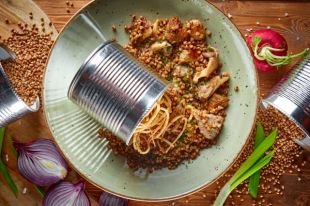 5Добавить гречневую кашу в сковороду и хорошо перемешать. После этого добавить оливковое масло, соль, перец и соевый соус.