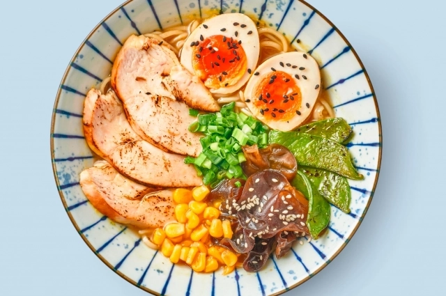 Шаг 10. Маринованное яйцо разрезать пополам и выложить сбоку на лапшу. Рядом красиво разложить слайсы куриной грудки, стручковый горошек, грибы муэр и острую кукурузу.