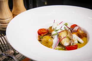 Кальмары гриль с молодым картофелем и жёлтым перечным соусом