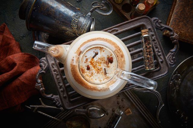 1Масала микс: Все специи соединить с 650 мл воды и довести до кипения, после чего добавить черный чай. Снизить температуру и варить 15 мин, затем остудить и процедить. Взять 150 мл.