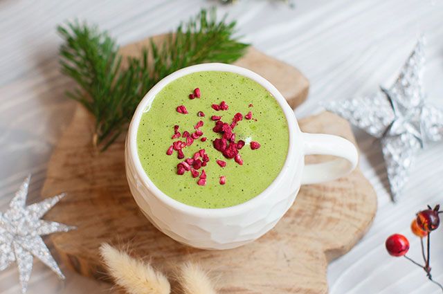 Готовый напиток украсить хлопьями дегидрированной малины.