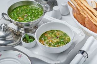 5В тарелку выложить петрушку, базилик, шпинат, залить готовым супом.
