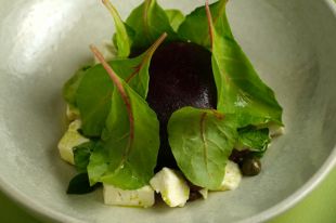 3В центр тарелки выложить подогретую свеклу, вокруг разложить кубики сыра, маслины, каперсы и листья мангольда. Сбрызнуть оливковым маслом.