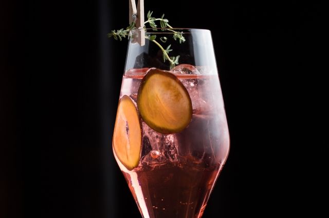 В бокал для шампанского мы наливаем сливовый сироп и игристое вино. Затем наполняем бокал льдом и украшаем его кусочками свежей сливы и тимьяна, не забывая немного «прихлопнуть» его ладонями, чтобы усилить ароматическую составляющую.