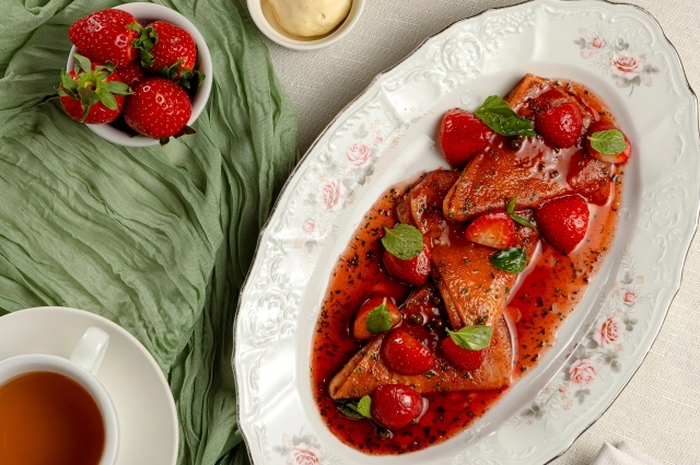 Блины с клубникой фламбе и базиликом