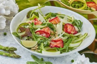 2На дно тарелки выложить соус, сверху — микс-салат. Спаржу тонко нарезать вдоль, добавить горошек, лосося холодного копчения, миндальные лепестки, украсить пармезаном.