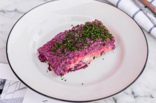 1Овощи запечь с солью и маслом в духовке при температуре 180 градусов до готовности. Остудить и натереть свеклу, картошку и морковь на мелкой терке.