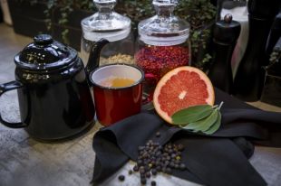 Заварить цветы ромашки в горячей воде в течение 7-10 минут, добавить ягоды можжевельника, шалфей грейпфрутовый фреш, сироп из пряностей, дать настояться в течение 10 минут.
