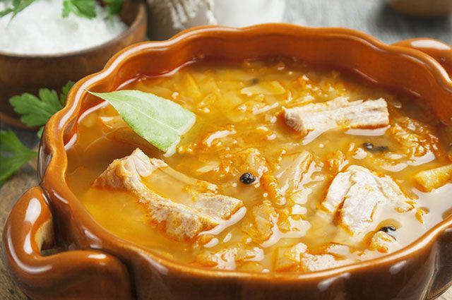 Соединить бульон с пассерованным луком, морковью, болгарским перцем и томлёной квашеной капустой.