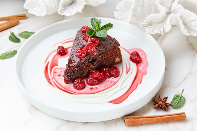 8Пропитанный пирог перед подачей поливается вишневым пуншем и украшается соусом тофу.