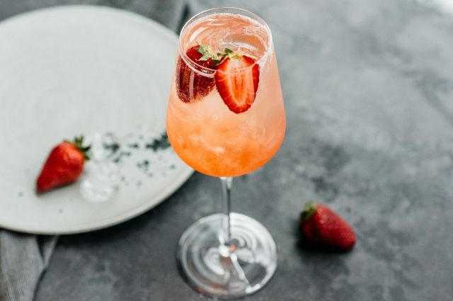 2Для приготовления напитка берем 30 мл получившегося клубничного шраба, белый ром и 50 мл игристого вина. Все заливаем в винный бокал непосредственно на лед, хорошенько перемешиваем и добавляем еще 80 мл игристого. Украшаем свежей клубникой.