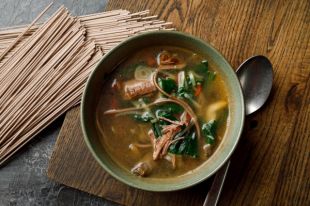 7Добавить гречневую лапшу и варить еще 3 минуты до готовности лапши, добавить соевый соус и соль.