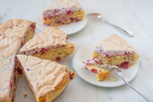 На готовый пирог выложить ягоды, сверху — белки. Поставить в духовку на 150 градусов. Запекать в течение 7-10 минут.