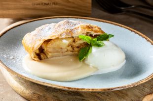 Когда штрудель будет готов, нарезаем его на кусочки и выкладываем на тарелку. подавать с мороженым и ванильным сиропом.