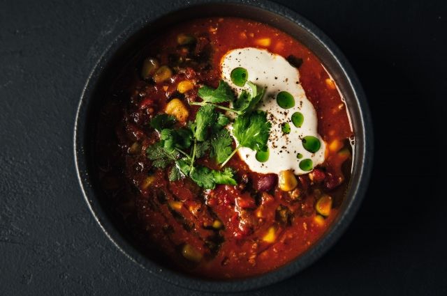 4Подаем суп со свежими листьями кинзы и жирной сметаной. Рекомендуется также добавить немного копченой паприки и пару капель зеленого масла петрушки.