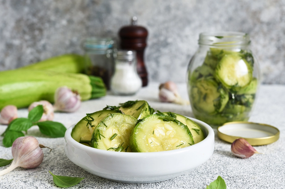 Ингредиенты: 2 л воды, 6 ст. л. соли, 3 кг кабачков, 2 головки чеснока, 1/2 пучка укропа, 2 листа хрена, по 4–5 листьев дуба, вишни и чёрной смородины, 10 горошин чёрного перца.