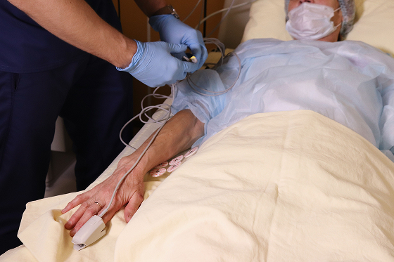 На протяжении всего сеанса доктор отслеживает показатели насыщения крови кислородом с помощью кардиомонитора. Параллельно проводится контроль артериального давления, снимается электрокардиограмма.