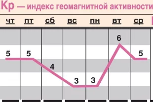 При болезнях сердца и сосудов всю неделю лучше строго соблюдать назначения врача, так как ожидаются 4 дня магнитных бурь: 3 дня бури лёгкие (Кр 5), 1 день — средние (Кр 6). Ещё один день с возмущённой магнитосферой.