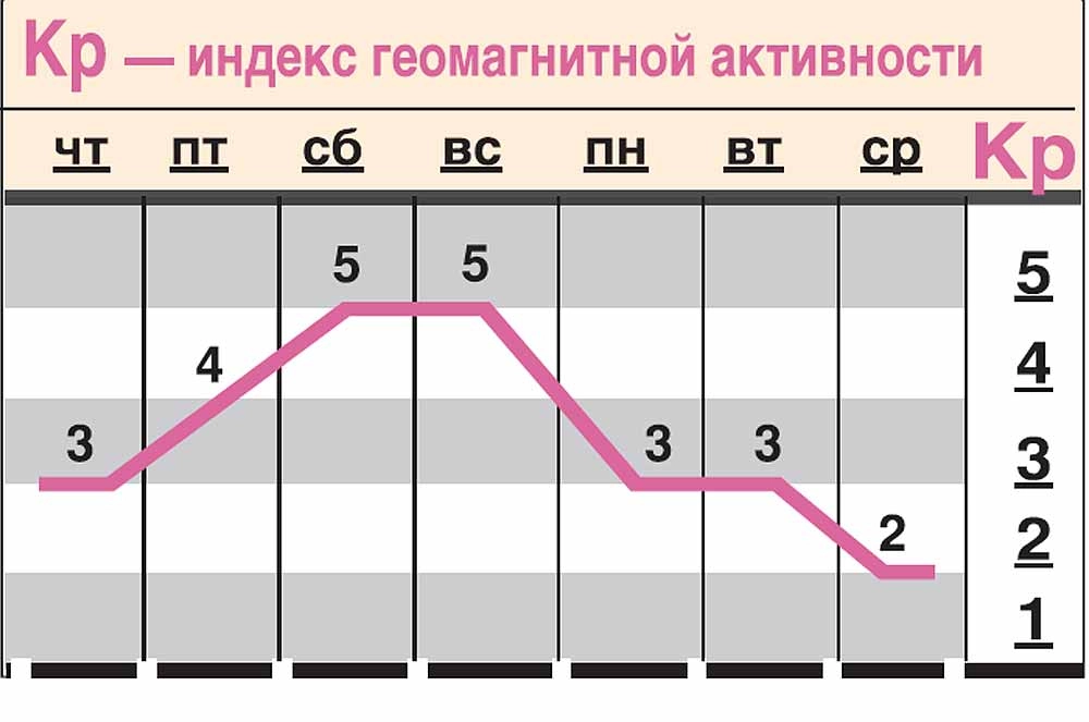 В субботу и воскресенье будет магнитная буря (Кр 5), а в пятницу — возмущённая магнитосфера (Кр 4). При болезнях сердца и сосудов в эти и смежные дни тщательнее следите за здоровьем и строго соблюдайте назначения врача.