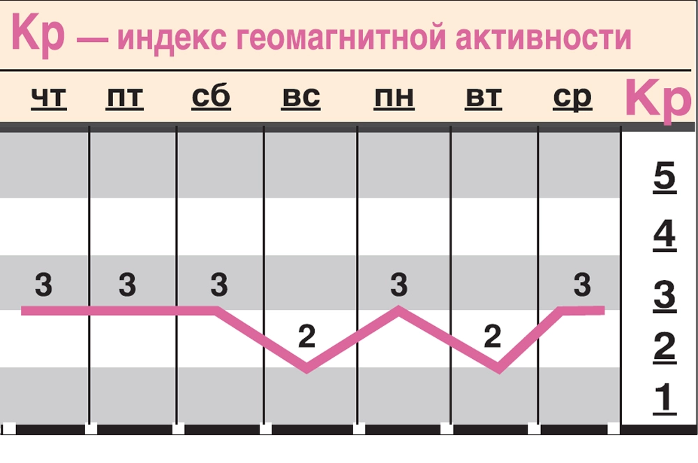 Геомагнитный фон ожидается слабовозмущённым (Кр 2-3) на протяжении всей недели. Магнитных бурь не прогнозируют. Дополнительные меры не нужны даже при хронических заболеваниях сердца и сосудов.