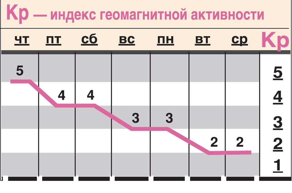 В четверг прогнозируют слабую магнитную бурю (Кр 5), в пятницу и субботу магнитосфера возмущённая (Кр 4). В эти и смежные дни при болезнях сердца и сосудов может понадобиться приём дополнительных лекарств.
