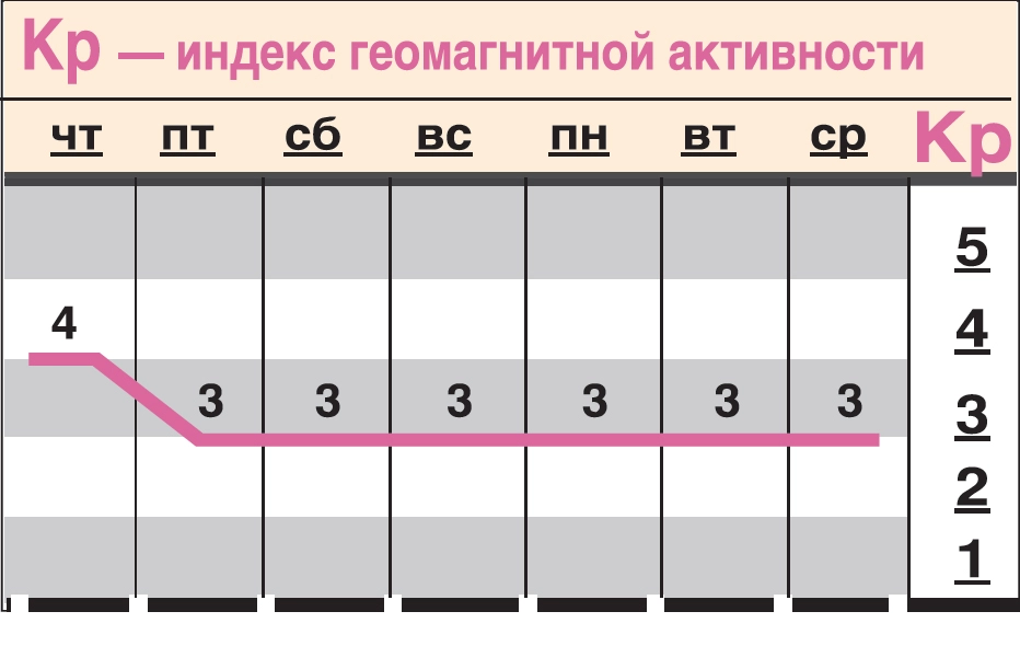 В четверг магнитосфера ожидается возмущённой (Кр 4). Это ещё не магнитная буря, но в этот и смежные дни людям с хроническими болезнями сердца и сосудов лучше быть осторожными и строго соблюдать лечение.