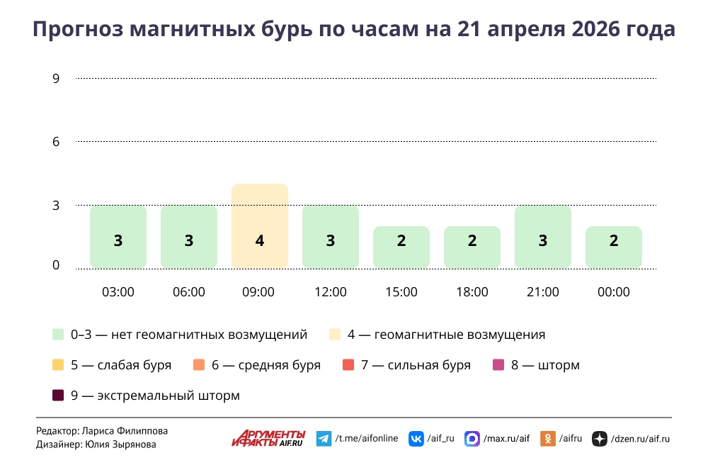 Прогноз магнитных бурь по часам на 21 апреля 2026 года. Инфографика