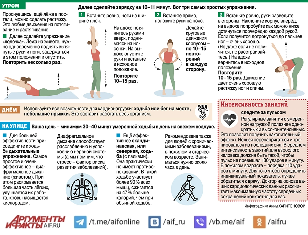 Далее сделайте зарядку на 10-15 минут. Вот три самых простых упражнения: