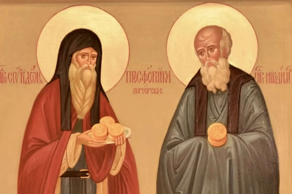 Никодим и Спиридон. Они жили в XII веке и были оба насельниками Киево‑Печерского монастыря. Они более 30 лет жили в Ближних (Антониевых) пещерах и занимались там выпеканием просфор — богослужебного литургического хлеба. Есть легенда, что однажды печь и пол вокруг нее загорелись, что угрожало большим пожаром всему монастырю, но Спиридон накрыл пожар своим плащом, и огонь чудесным образом погас. Спиридон и Никодим были неразлучны и деятельны до самой смерти. А потом их похоронили в пещерах, где они провели большую часть жизни.