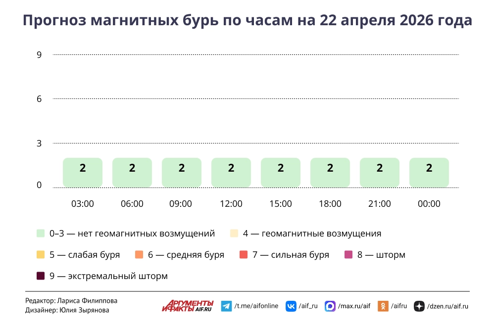 Прогноз магнитных бурь по часам на 22 апреля 2026 года. Инфографика