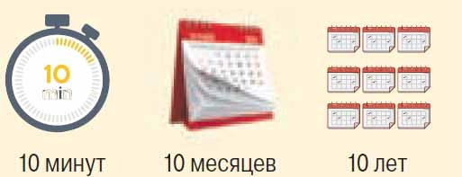 Допустим, речь о переезде в другой город. Через 10 минут, вероятно, вы будете чувствовать тревогу и сомнения. Через 10 месяцев уже освоитесь на новом месте, заведёте новые знакомства, ощутите уверенность. А через 10 лет будете воспринимать этот шаг как одно из ключевых событий, повлиявших на вашу карьеру и жизнь в целом. Данный приём помогает понять, что эмоции настоящего – это ещё не всё, тревога – вещь временная, а в долгосрочной перспективе сложное решение может иметь выгоды.