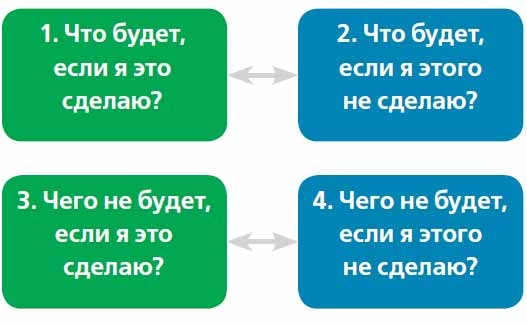 Ответив на эти вопросы, вы рассмотрите ситуацию со всех сторон. Например, вы думаете о смене работы и спрашиваете себя: «Что будет, если вы уйдёте?» Мозг подсказывает ответы: вас могут ждать иные перспективы, рост дохода, новые социальные связи. А что будет, если вы останетесь? И тут есть свои аргументы: стабильность, привычная команда, знакомые задачи, не вызывающие стресса. Чего вы лишитесь, если уйдёте? Комфорта и уверенности в своих умениях и навыках. Чего у вас точно не будет, если вы останетесь? Развития, ощущения движения вперёд, увеличения дохода.