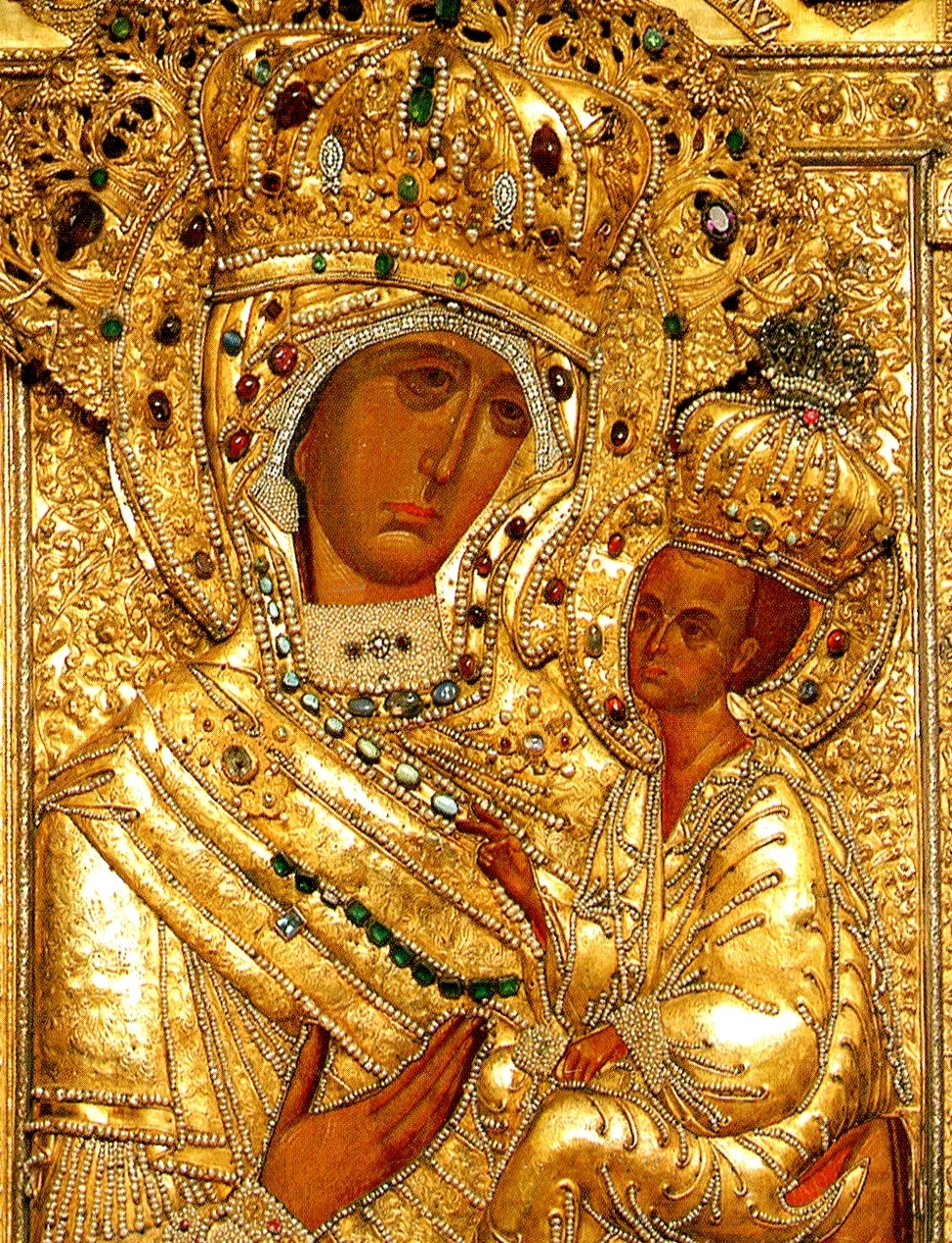 Согласно преданию, этот образ — один из тех, которые святой евангелист Лука написал еще при жизни Богоматери, а значит, она сохранила реальные черты лица девы Марии. Эта икона была в V веке перенесена из Иерусалима, где была создана и хранима, в Константинополь. Здесь она была установлена в Влахерском храме, который построили специально для нее. Но в 1383 году образ исчез их той церкви, а потом чудесным образом явился в городе Тихвине. Она тогда защитила город от врагов, и в ее честь установили праздник, а также построили храм в честь Успения Богородицы и монастырь вокруг нее, где образ сохраняли. Когда в 1613-14 годах на Тихвин надвигались шведы, монахи попытались бежать, взяв с собой икону, но не смогли сдвинуть ее с места. Это показало монахам их трусость. Они дали бой врагу и победили. Образ увозили после революции в США, однако в 2004 году вернули в его родной монастырь.