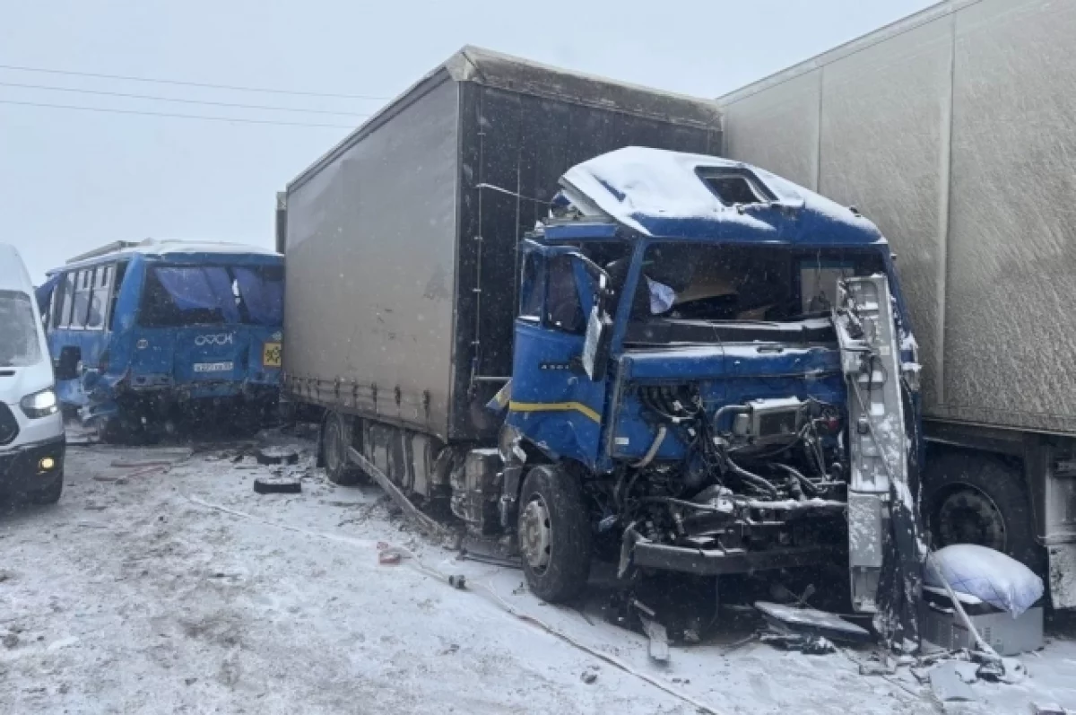 На снимках зафиксированы значительные повреждения пассажирского автобуса и двух грузовиков. На месте происшествия работают сотрудники правоохранительных органов, спасатели и представители ГИБДД.