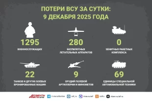 Минобороны РФ опубликовало данные о потерях ВСУ за 9 декабря 2025 года. Противник недосчитался 1295 военнослужащих.