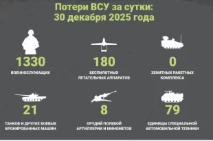 Минобороны РФ опубликовало данные о потерях ВСУ за 30 декабря 2025 года. Противник не досчитался 1330 военнослужащих.