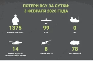 Минобороны РФ опубликовало данные о потерях ВСУ за 3 февраля. Противник не досчитался 1375 военнослужащих.