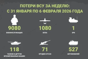 Минобороны РФ опубликовало данные о потерях ВСУ за период с 31 января по 6 февраля. Противник лишился в боях с нашей армией 9080 солдат.