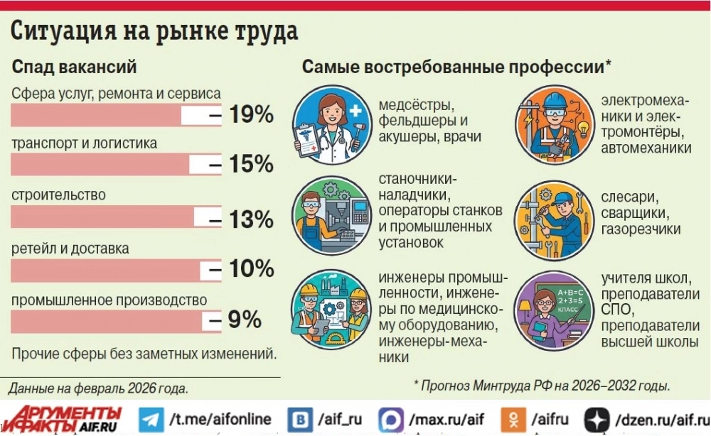 В целом рынок труда действительно охладился по сравнению с 2022, 2023 и 2024 годами. Охлаждение носит структурный, а не конъюнктурный характер и обусловлено совпадением нескольких причин: высокая ключевая ставка ЦБ резко увеличила стоимость кредита, ухудшила финансовое положение компаний; происходит замедление ВВП. В 2025 году он вырос на 1 % против 4,3 % в 2024-м, в начале 2026 г. ВВП и вовсе сократился на 2,1 %. Выросла налоговая нагрузка на бизнес (в частности, повышение НДС с 20 до 22 %). Исчерпаны такие импульсы развития, как бюджетное финансирование, льготная ипотека и импортозамещение как драйвер роста. Наибольший спад вакансий наблюдается (в феврале, год к году) в сфере услуг, ремонта и сервиса — на 19 %, транспорте и логистике — на 15 %, строительстве на 13 %. IT в целом «охладился» на 13 %, в ретейле и доставке сокращение вакансий на 10 %, промпроизводстве на 9 %. Наименьше сокращение в медицине и образовании — на 1-2 %, точечно. Особо выделяются IT-джуниоры: «золотое время» для начинающих разработчиков завершилось — спрос сосредоточился на middle/senior-специалистах в ИИ и кибербезопасности. В сегменте управления персоналом (HR), инвестиций и консалтинга также зафиксировано наиболее заметное сокращение вакансий. Снижается потребность в HR-менеджерах, сотрудниках автосалонов, складском персонале и офисных служащих.