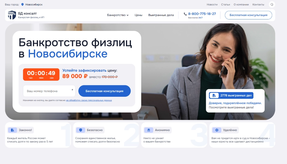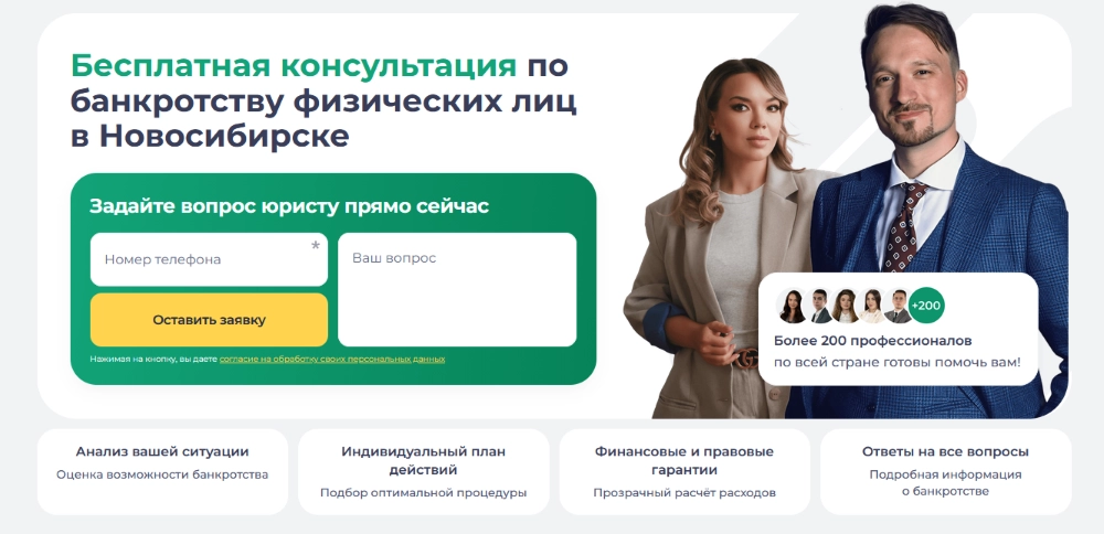 Компания ведёт дела по всей стране и предлагает дистанционный формат работы. Для жителей Новосибирска это означает возможность пройти процедуру без личных визитов. В команде более 300 юристов, многие из которых работают в сфере банкротства свыше 8 лет.