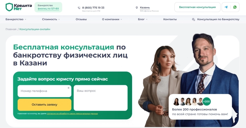 «КредитаНет» — лидер нашего топа компаний по банкротству в Казани. У фирмы есть офисы партнеров в 100+ городах России. В команде работают юристы с опытом от 8 лет, которые помогли списать клиентам долги на сумму свыше 3 млрд рублей.