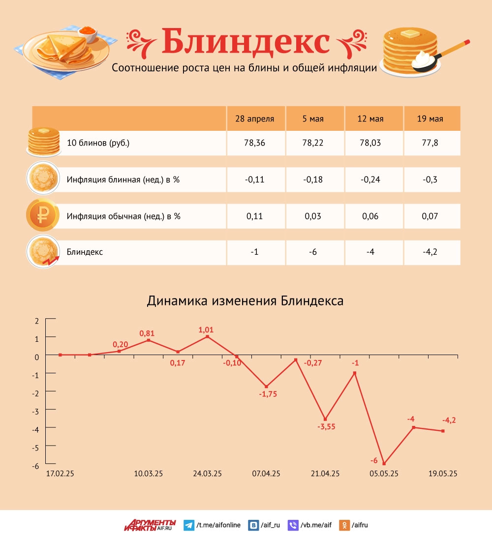 Напомним, блиндекс — это показатель, который aif.ru рассчитывает еженедельно. Он показывает соотношение изменения цен на самые необходимые для выживания продукты и на все остальные товары и услуги в стране. Классический рецепт блинчиков не включает в себя слишком дорогостоящих ингредиентов — яйца, мука, молоко, масло, соль и сахар. Эти продукты покупают все, а значит, и инфляция по ним тоже касается большинства граждан. И уже два месяца подряд цены на них с завидным постоянством падают.