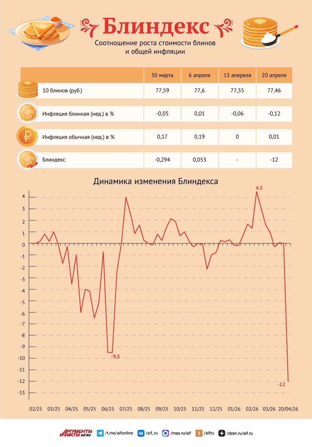 Соотношение «блинной» и общей инфляции, или блиндекс, который корреспонденты aif.ru анализируют каждую среду, стал равен 12. Классический рецепт блинчиков не включает в себя слишком дорогих ингредиентов (в нем только яйца, мука, молоко, сливочное и подсолнечное масло, соль и сахар), и эти продукты покупают все, значит, и инфляция по ним тоже касается большинства граждан.