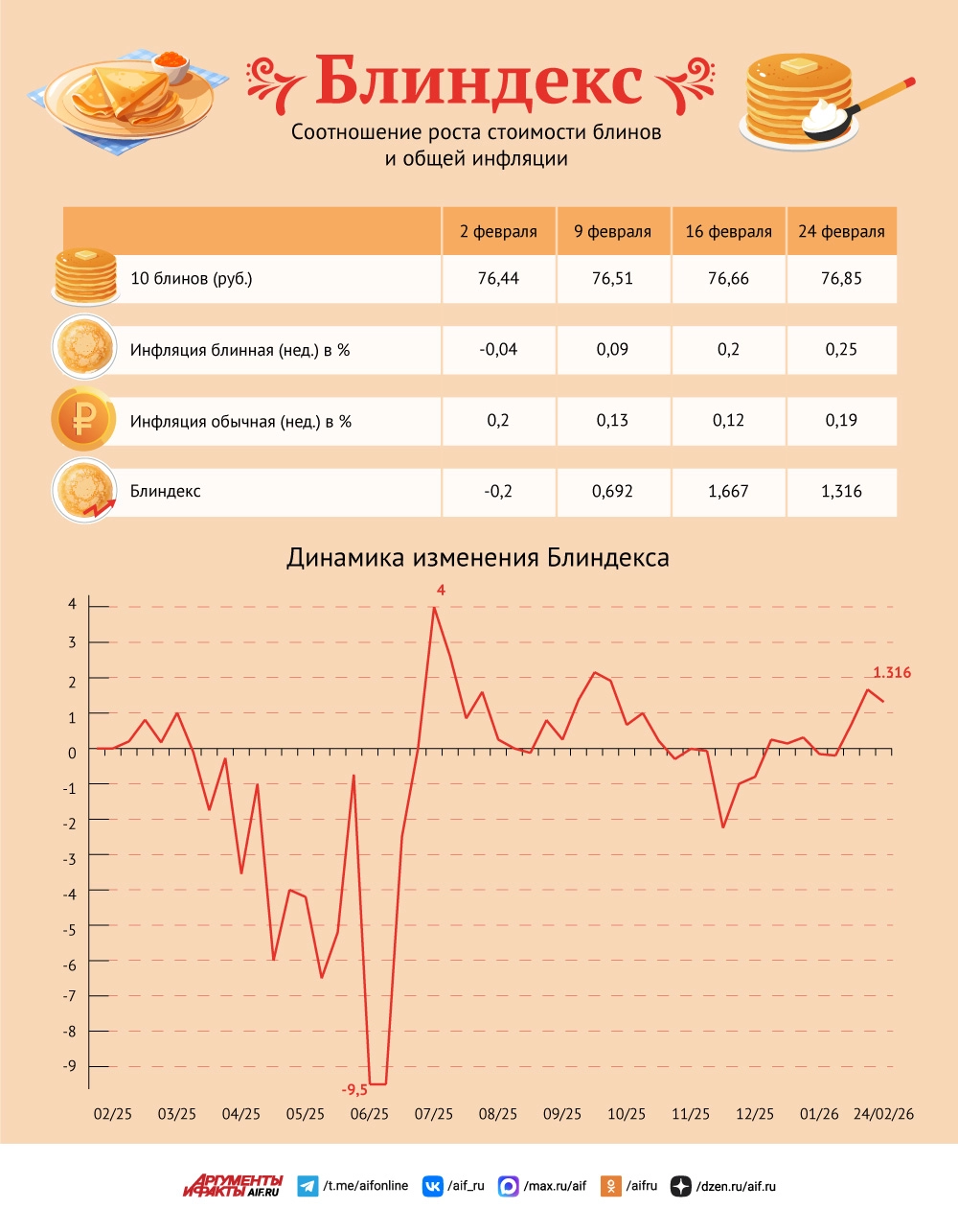 Самые важные продукты, среди которых пастеризованное молоко, сахар-песок и десяток куриных яиц, дорожают быстрее инфляции. Так, например, 16 февраля за продукты для приготовления десяти румяных блинчиков пришлось бы отдать 76,66 руб., а 24 числа — уже 76,85 руб., или на 0,25% больше. Учитывая общую инфляцию 0,19%, блиндекс (то есть, их соотношение) равнялся 1,316.