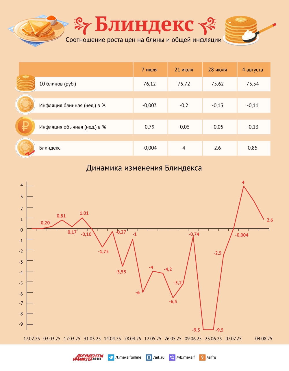 Напомним, блиндекс — это показатель, который aif.ru рассчитывает еженедельно. Он показывает соотношение изменения цен на самые необходимые продукты и на все остальные товары и услуги в стране. Классический рецепт блинчиков не включает в себя слишком дорогостоящих ингредиентов — яйца, мука, молоко, масло, соль и сахар. Эти продукты покупают все, а значит, и инфляция по ним тоже касается большинства граждан.