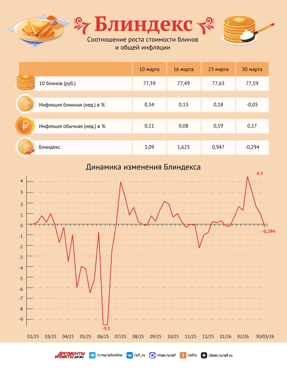 Соотношение «блинной» и общей инфляции, или блиндекс, значение которого aif.ru рассчитывает еженедельно, в итоге составил −0,294. Классический рецепт блинчиков не включает в себя слишком дорогих ингредиентов (в нем лишь яйца, мука, молоко, сливочное и подсолнечное масло, соль и сахар), и эти продукты покупают все, значит, и инфляция по ним тоже касается большинства граждан.