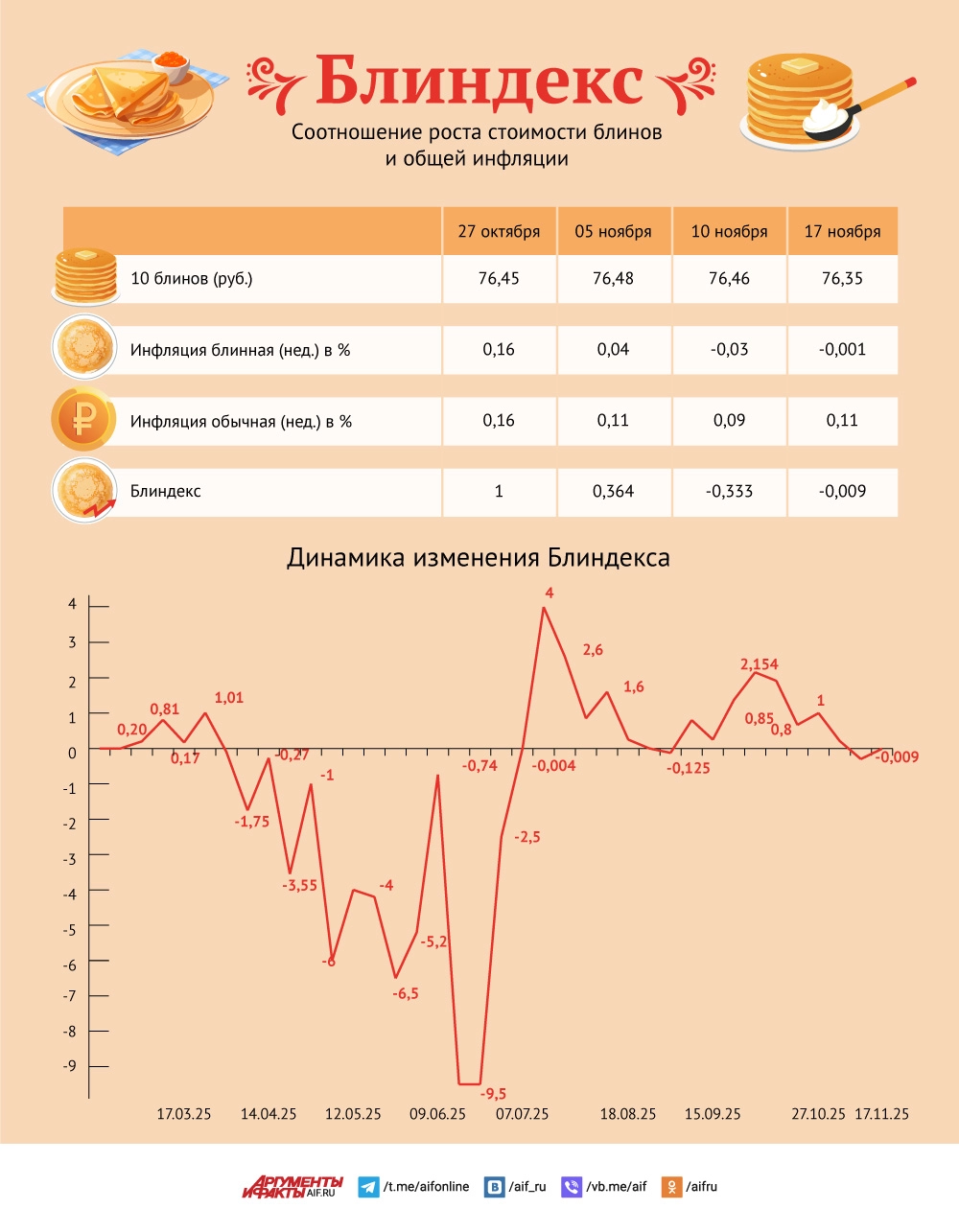 Блиндекс показывает соотношение изменения цен на самые необходимые продукты и на все остальные товары и услуги в стране. Классический рецепт блинчиков не включает в себя слишком дорогостоящих ингредиентов — яйца, мука, молоко, масло, соль и сахар. Эти продукты покупают все, а значит, и изменение цен на них тоже касается большинства граждан.